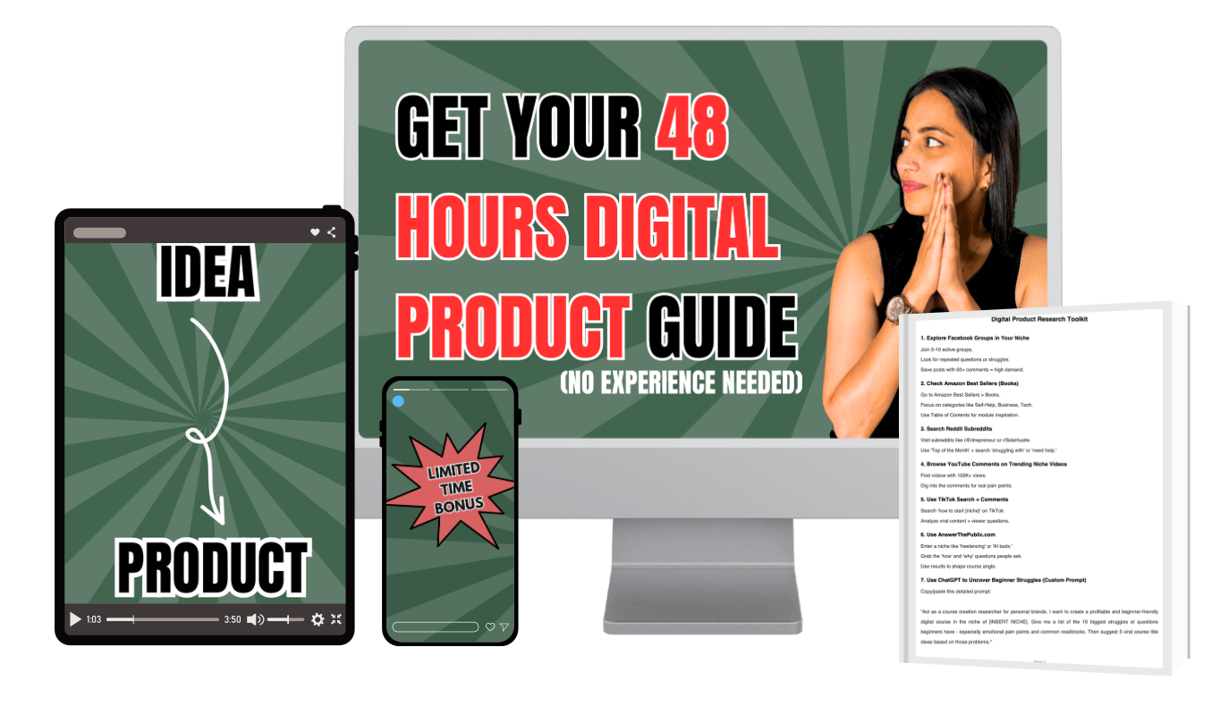 A simple step-by-step course that shows you exactly how to go from idea to launch your 48 hours digital product using AI, smart tools, and beginner-friendly systems.